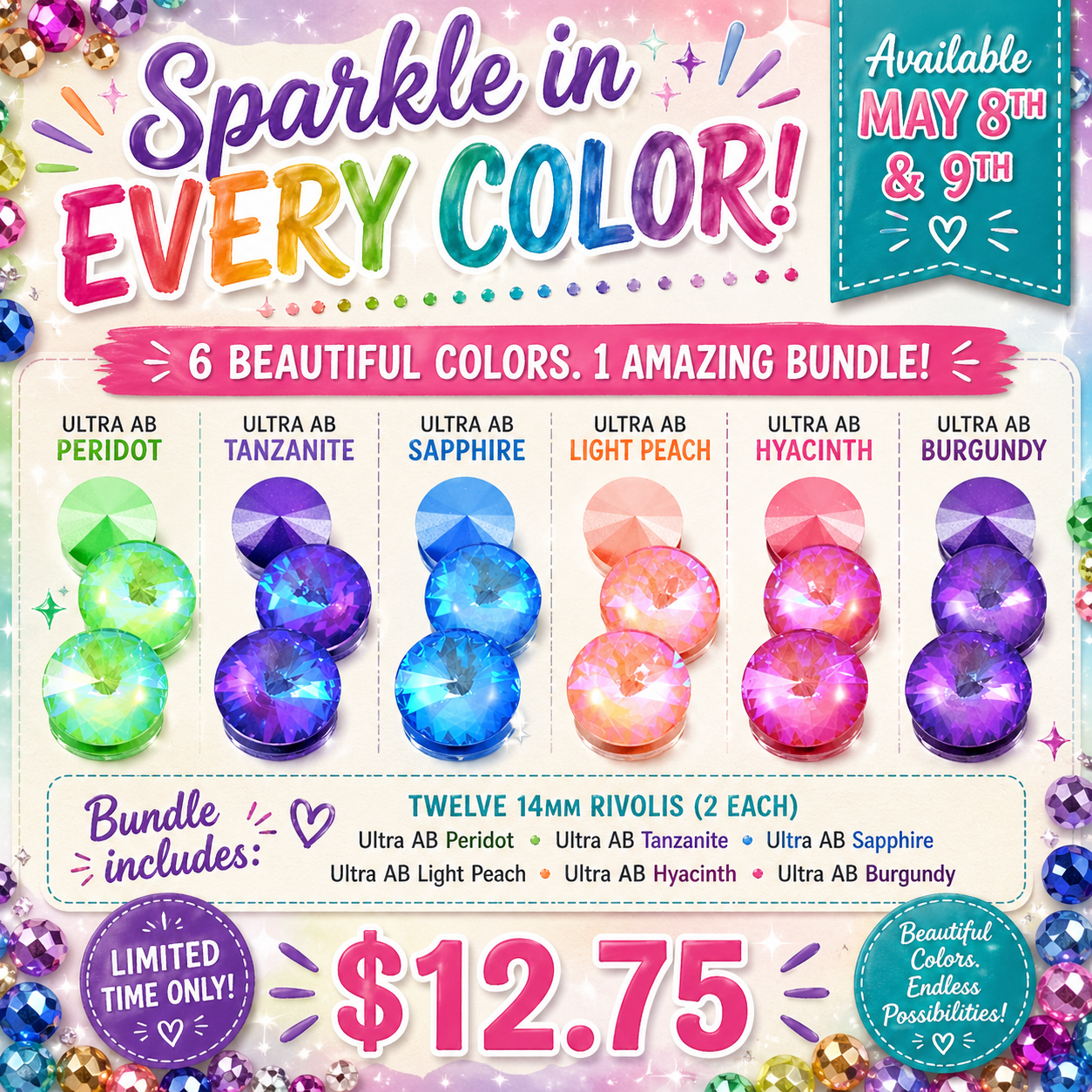 May 8th & 9th - Ultra AB Rivoli Assortment Bundle - 6 colors, two each, of Ultra AB colors. The bundle price is $12.75 and is only available for these two days. This bundle is worth $17.