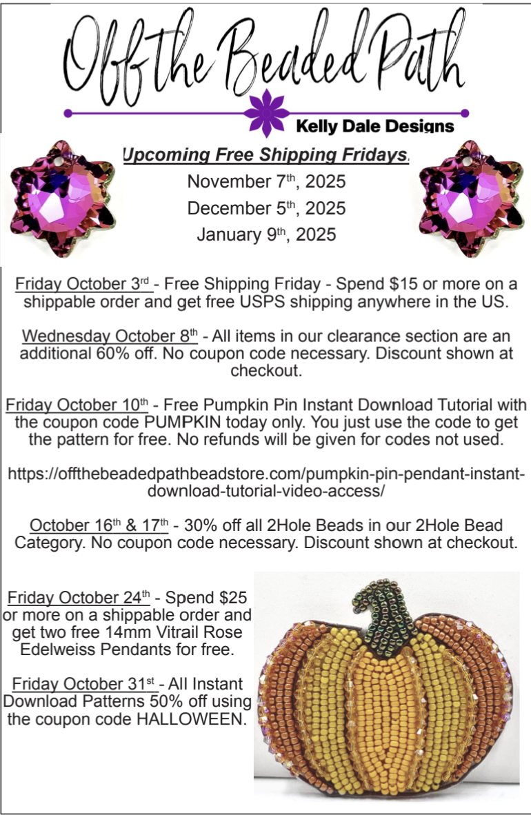 October 2025 Promotions Posted by Kelly Dale on Sep 28th 2025 #2025 #beaded path #edelweiss #october #october 2025 #off the beaded path #promotions Facebook Email Print Twitter Linkedin Pinterest